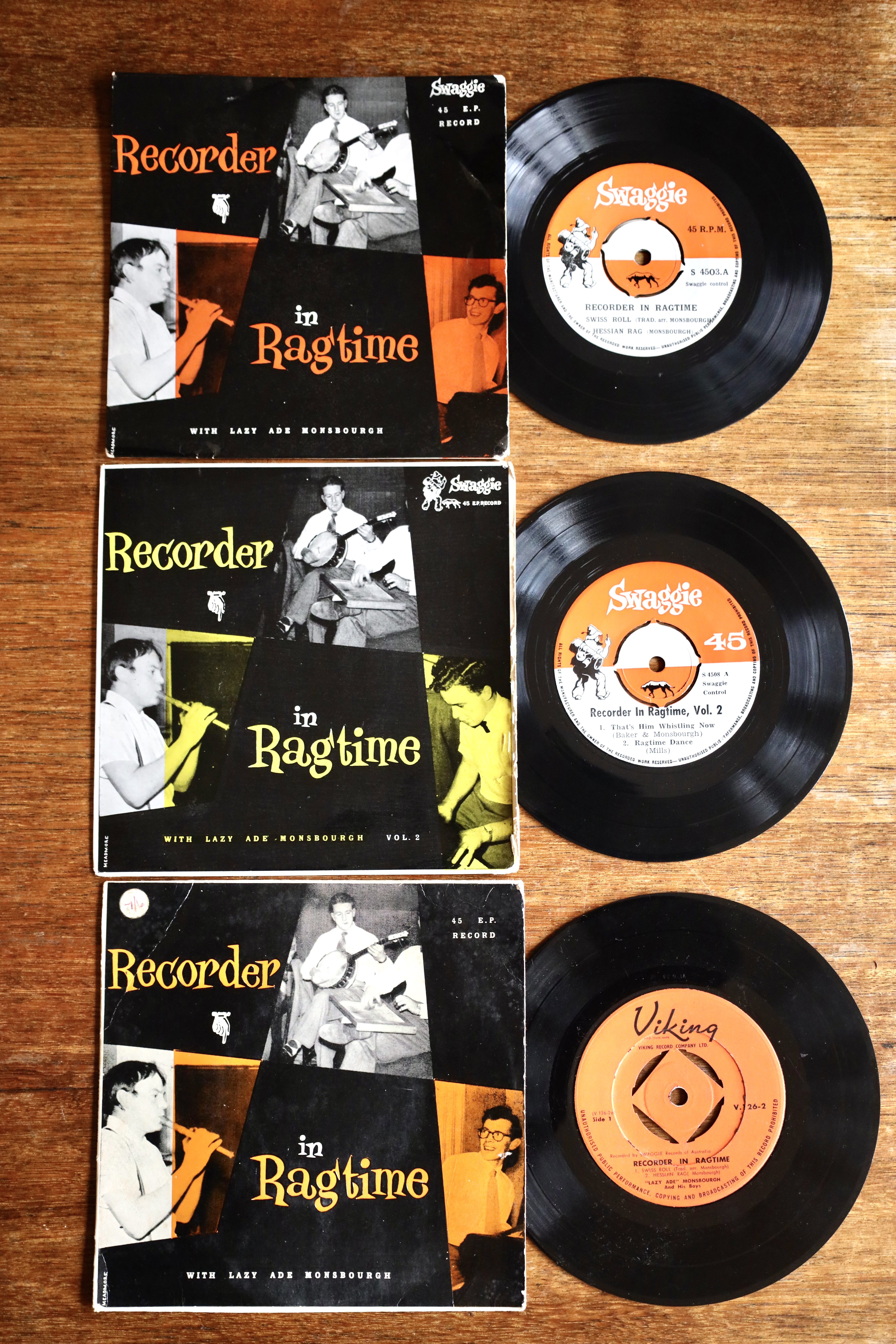 Ade Monsbourgh has been playing the recorder in jazz and ragtime since the early 1950s. His earliest recordings with recorder were made in 1954. Between 1954 and 1956 the Australian jazz label Swaggie issued twelve tracks with Ade on recorder. In the 1960s they were leased to EMI for release as a 12” LP on the Parlaphone label (Recorder in Ragtime PMEO 9602, Series 2, Mono). Ade also made six additional recordings in 1962 for the W&G Record company that were later acquired by Swaggie for inclusion in their more comprehensive 1985 Lazy Ade Monsbourgh: recorder in ragtime re-issue (3)—reviewed here.