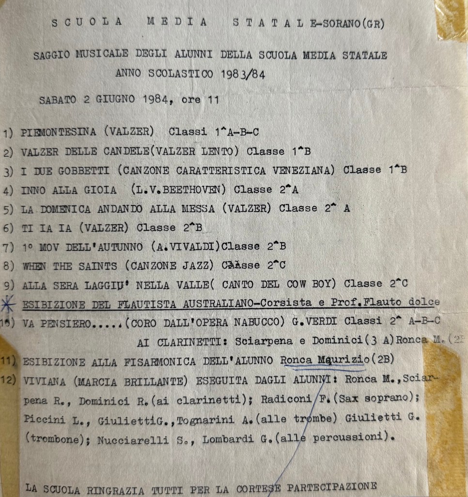 On June 2, 1984, the music teacher at the nearby scuola media statale Sorano (Years 7-9) invited me to perform in an end of term student concert. They were intrigued by the van Eyck piece I played for them, but the virtuosity of my playing was inferior to a 12-year-old student, Maurizio Ronca, who stunned everyone with his nimble-fingered fisharmonica (piano accordion) solo performance.