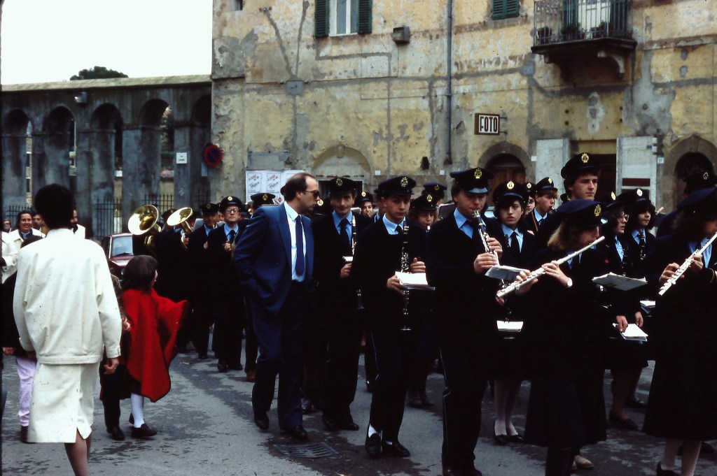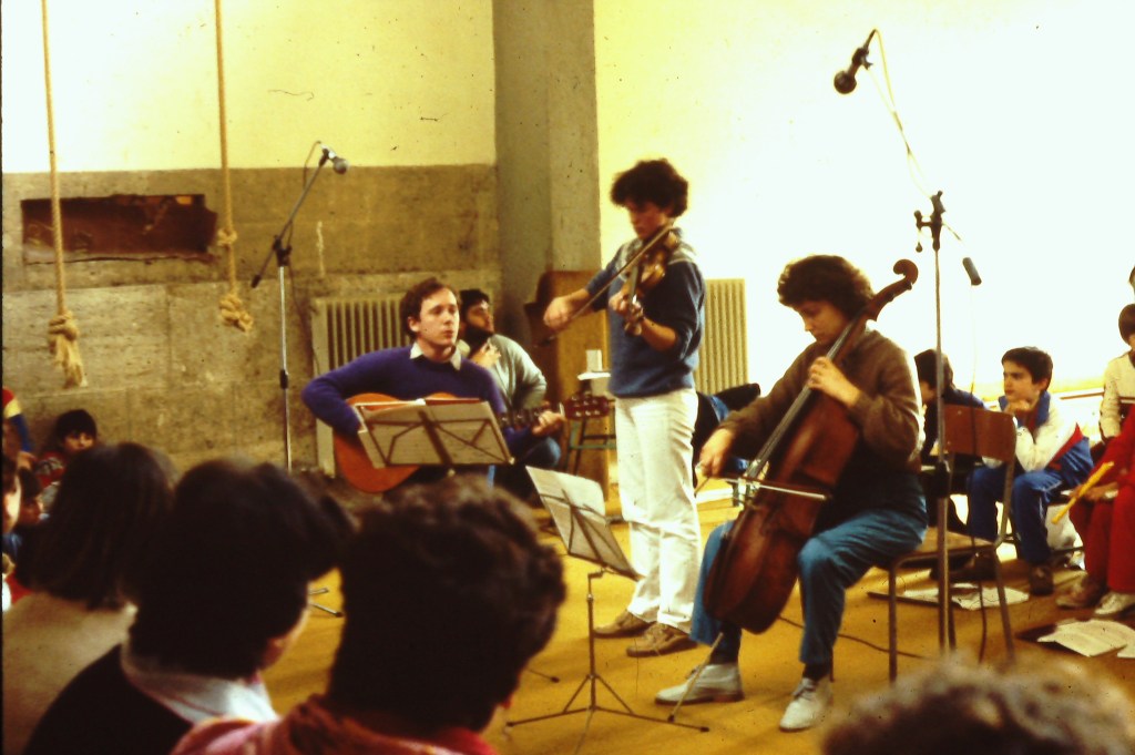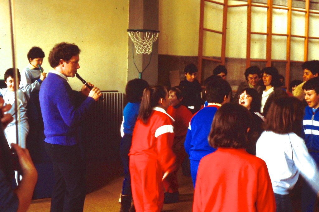 The children were beginners, and we made a deal that while I taught them recorder, they would help me to improve my Italian, an excellent way to learn a language quickly. It was a lot of fun, and for the children, teachers and parents, it was a gala occasion when the kids gave concerts at the end of each term, the second being recorded by Radiopitiglianuno, the local community radio station, and broadcast on Christmas Day 1984. This concert wound up with the Latin verse of O Come All Ye Faithful, after which the children broke spontaneously into the Heel and Toe Polka … “tacco, punto, tacco, punto, uno, due, tre, quattro” … all dancing and having a ball. My partner Liz (violin) and Caroline Boersma (‘cello) joined in our little ‘orchestra’ to accompany the students.