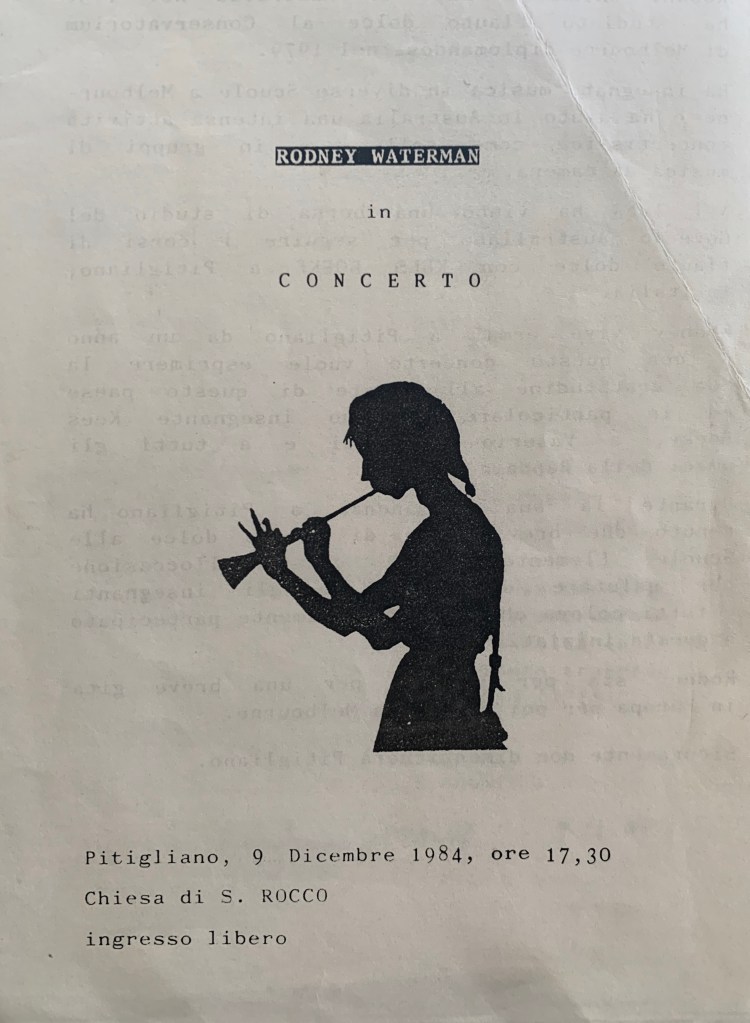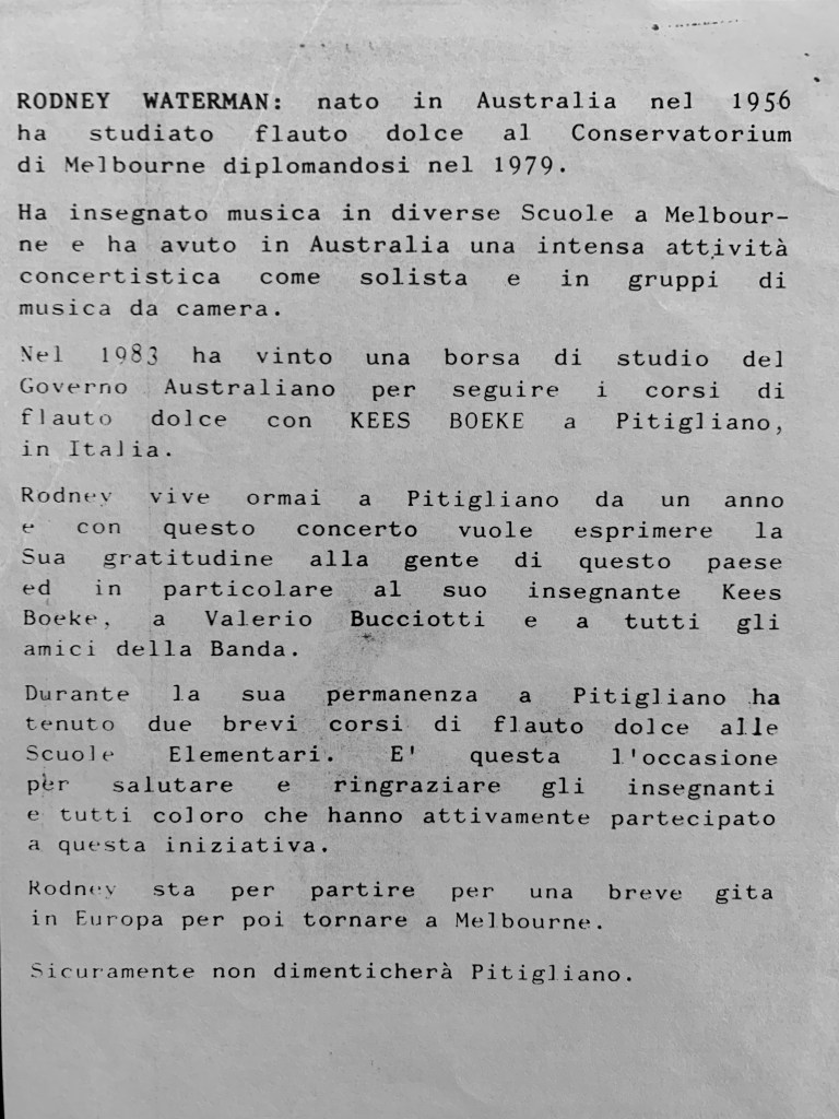 In 1983 Rodney was awarded an Australia Council grant to pursue studies with Kees Boeke in Italy and the Netherlands. While in Italy he gave several concerts and helped in the organisation of the Settimana Musicale di Pitigliano in 1984 and 1985. He also taught music for six months at the local primary school of Pitigliano in 1984. In this article Rodney gives an account of his musical and travel experiences during his two year sojourn in Europe, in particular, Italy.