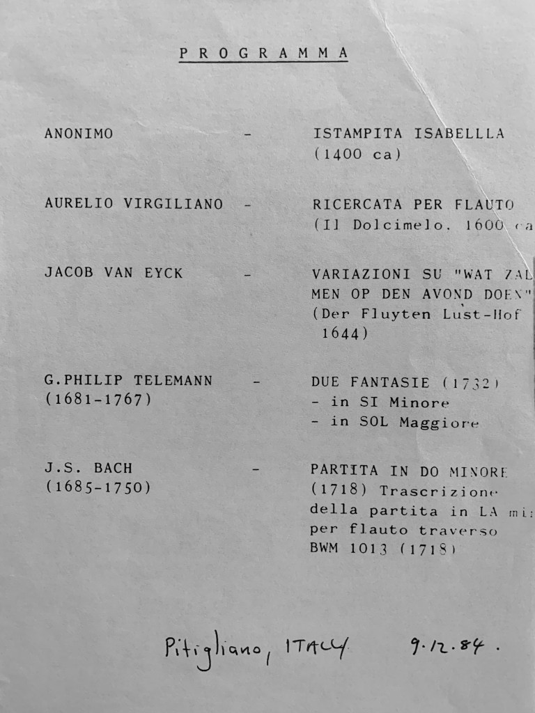 In December I coached some baroque ensembles at a private music school in Rome, and for the last musical activity at the end of my first year in Pitigliano (1984) I performed a public solo recital in the little church of San Rocco. The acoustics were a dream for the recorder, my only problem being that it was 3°C outside the church, and not much warmer inside.