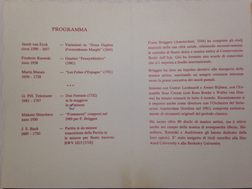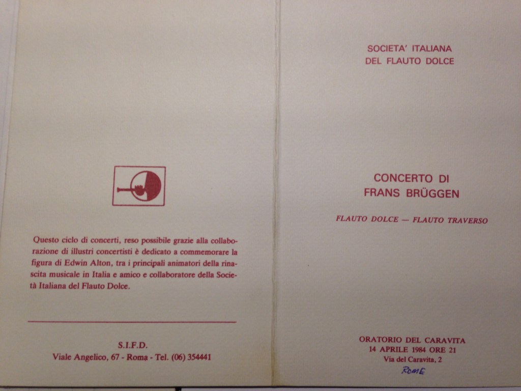 In April 1984 I heard Frans Brüggen perform in the Oratorio Del Caravita in Rome. It was organised by the Societa Italiana Del Flauto Dolce (Italian Recorder Society). The society organised several concerts each year, published new and old recorder music, ran a summer school each year in Urbino and published a rather academic periodical magazine. Unfortunately, the Brüggen concert was marred by traffic noise and a persistent burglar alarm sounding from without, but it was still a treat to hear him play. He had a commanding stage presence, dressed in a dark suit and white shirt, with grey hair and long, agile fingers. I was particularly impressed by his range of breathing techniques, from the most subtle to the deliberately rough and aggressive. I liked Frederic Rzewski’s Four Pennywhistlers and Shinohara’s Fragments. The Rzewski piece involved considerable interchange of recorders. He also played works by Bach, van Eyck, Marais and Telemann.