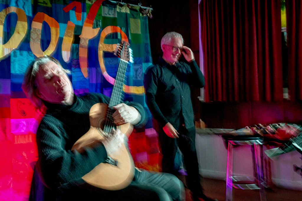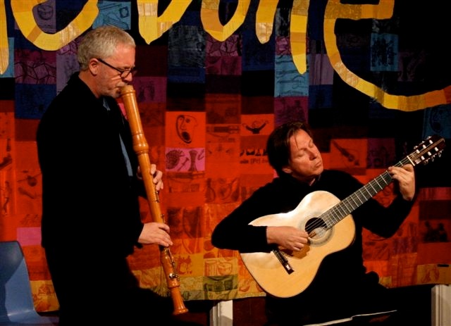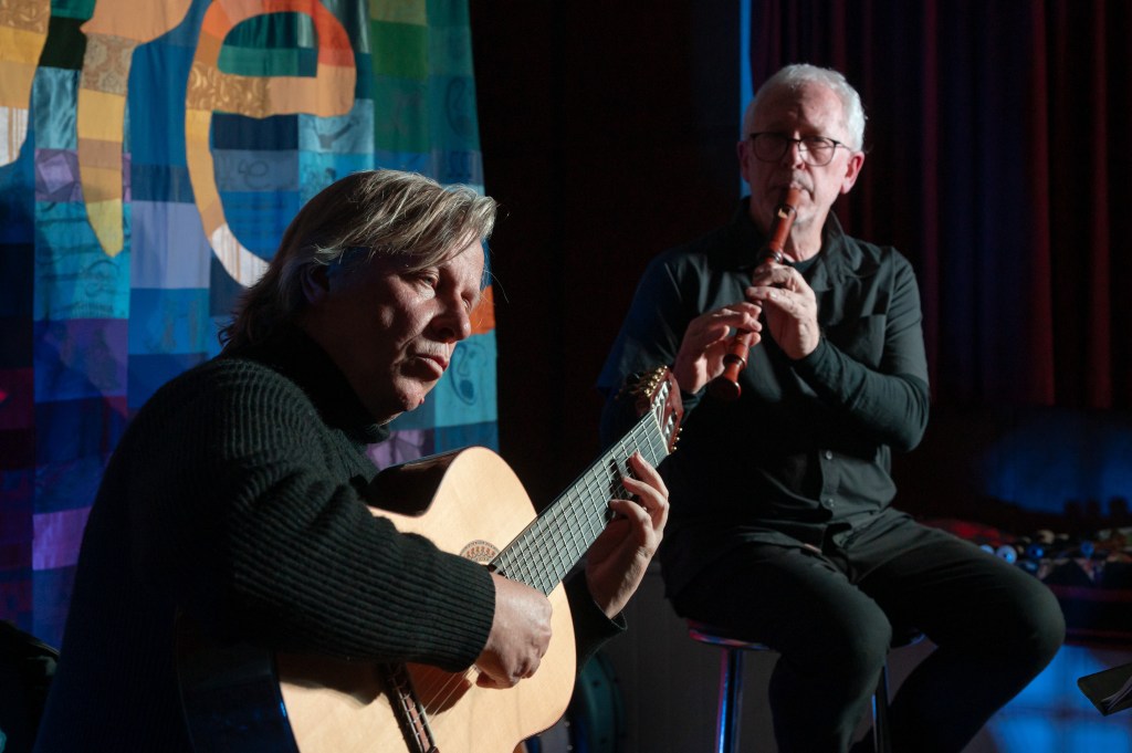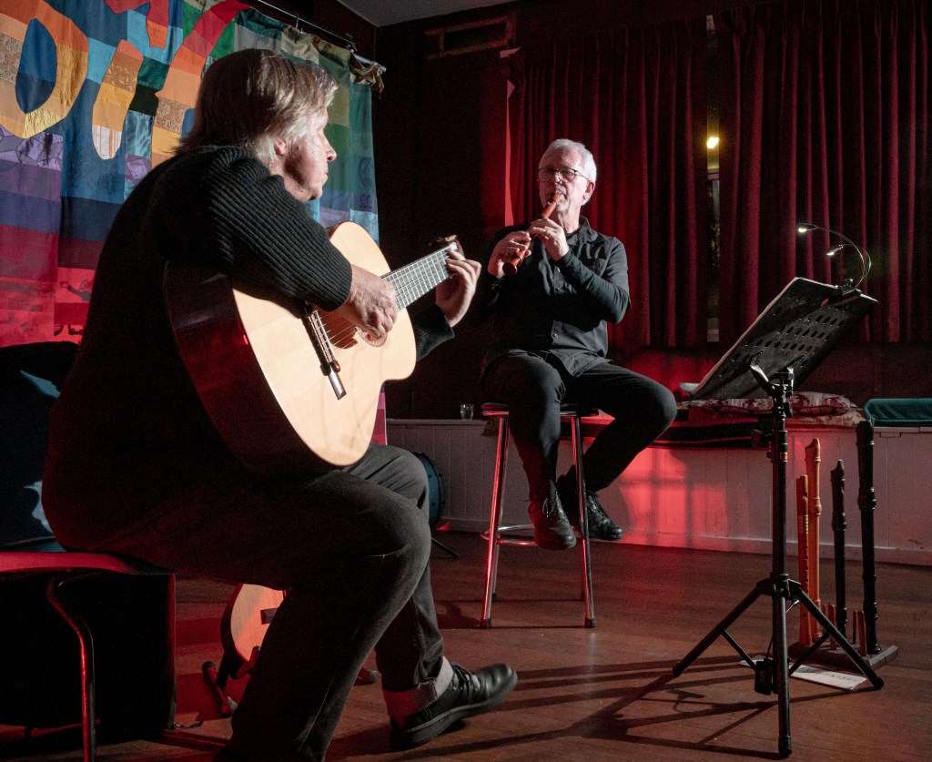 Água e Vinho was released in November 2000 on Egberto Gismonti’s Carmo label, manufactured, marketed and distributed by ECM Records, Germany. Rodney and Doug de Vries thought it was time to celebrate the quarter century anniversary of this unique recorder and guitar collaboration. Here are a few pics from the performance (click on individual images to see in full). Photos Martin Bennet and Bruce Rigby.